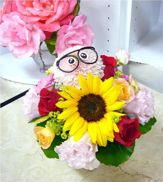 フラワーパパです。ピンポン菊にシールと針金でめがねを作ってお父さんの顔を作りました。2625円です。