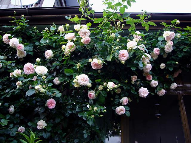 バラ好きさんのお庭を見せていただきました。花盛りで見ごろでした。切花とは違った魅力でお庭のバラは素敵ですねー。こちらはご自宅の軒下に咲かせてあるのですがなんだか豪華で別世界に来た気分になります。