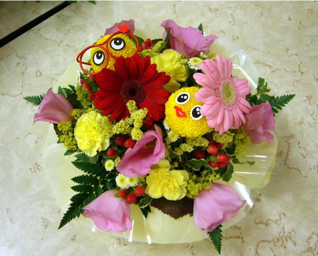 結婚が決まったお友達にプレゼントされるということで顔つきのアレンジメントの御注文をいただきました。フラワーパパの応用編といったところでしょうか。出来合いのピックをさすのではなくお花で顔を作るのもかわいいでしょ〜。出産祝い、誕生日、いろいろ遊べそうなアレンジでーす。