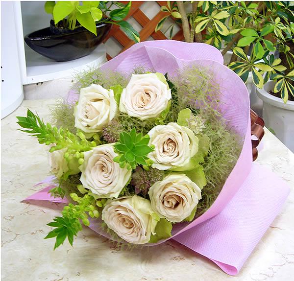 上品なお花を使ってというご注文でした。ちょうど素敵なバラが入荷したのでスモークツリーとパイナップルリリーをあわせました。シックな色の花束です。このバラもなかなか入荷しません。タイミングよく素敵なバラが入荷するなんて日頃の行いのよいお客様なのかしら。
