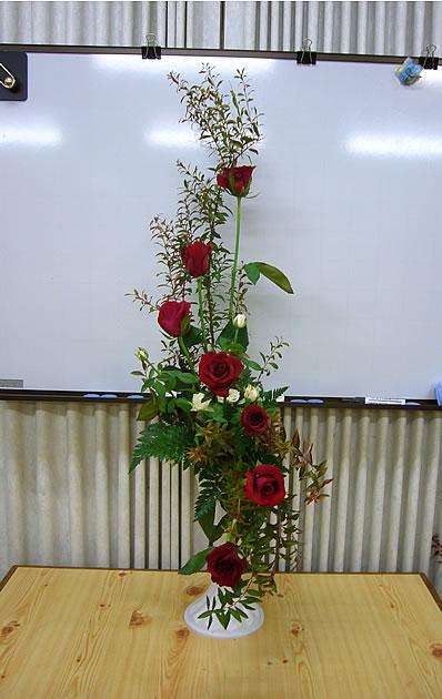 本日の教室は『エスカーブ』の基礎編です。7本のバラで作りました。S字型に自然な流れを止めないように気をつけて生けていきます。教室ではわかりやすいように縦型のエスカーブです。