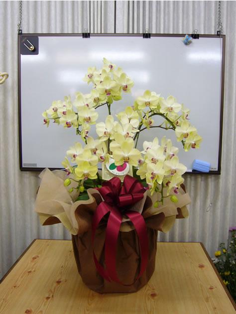 本日お誕生日のお祝い用にお届けした胡蝶蘭です。めずらしくて長持ちするものというご注文でしたので入荷しました。黄色い胡蝶蘭でも、このタイプのようにあまり花びらに模様が入ってないものは、私は今まで見たことありませんでした。市場にたまたま入荷していたので買えたのですが、普段なら注文しても来るかどうか。きてもめちゃめちゃ高い!ということで注文はとれないのですが、あんまりきれいなのでアップ。