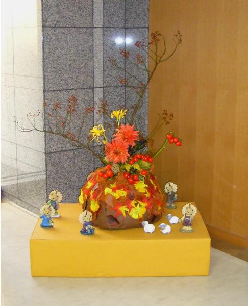 こちらは玄関用秋の野山(のつもり。まんじゅう山?)です。日、月とお休みなので火曜日の午後に配達に伺ったときにお花は交換かなー。