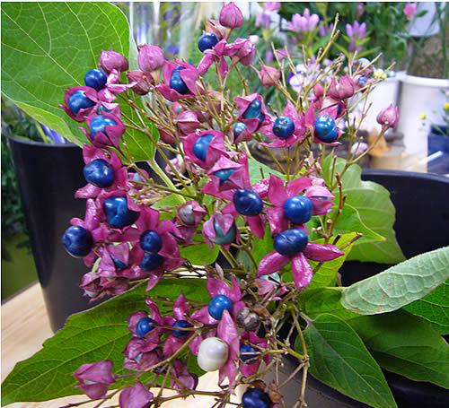 外側が赤いのに実が真っ青というのが不思議です。秋らしい花材ですねー。