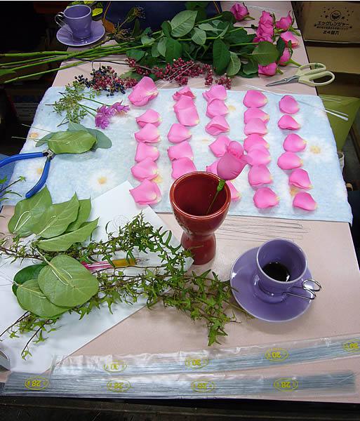 今日は大河内教室です。本日はビクトリアンローズ。まずは花びらをはずしてワイヤリングの準備。