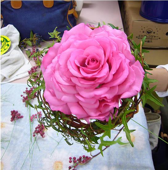 ここまで出来ました。ビクトリアンローズの直径は12センチぐらいかなー。その周りにあかづるでリングをつくりました。