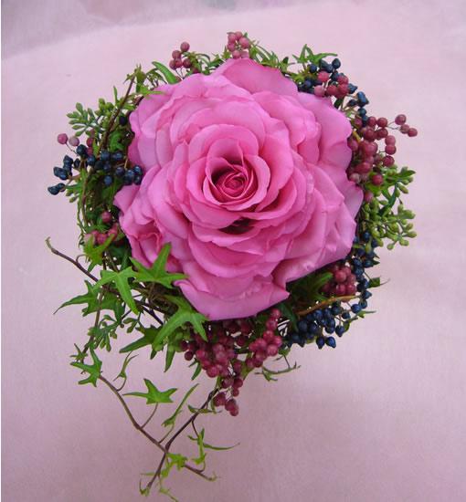 周りにビバーナムやピンクペッパーなどの実物を飾りました。実りの秋のビクトリアンローズなんちゃって。結構大きく仕上がりました。