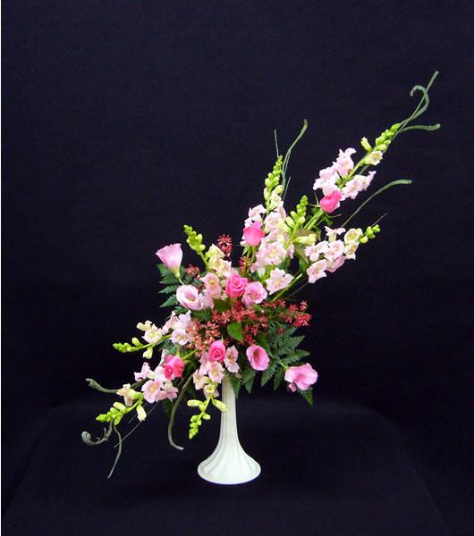 今日はダイアグナルの研究科です。といっても前回の基礎科の復習のようなものです。エニシダが面白い花材なのでのびのびと生けましょう。今回の花材はエニシダ、スナップ、バラ、クリスマスブッシュ、トルコキキョウです。