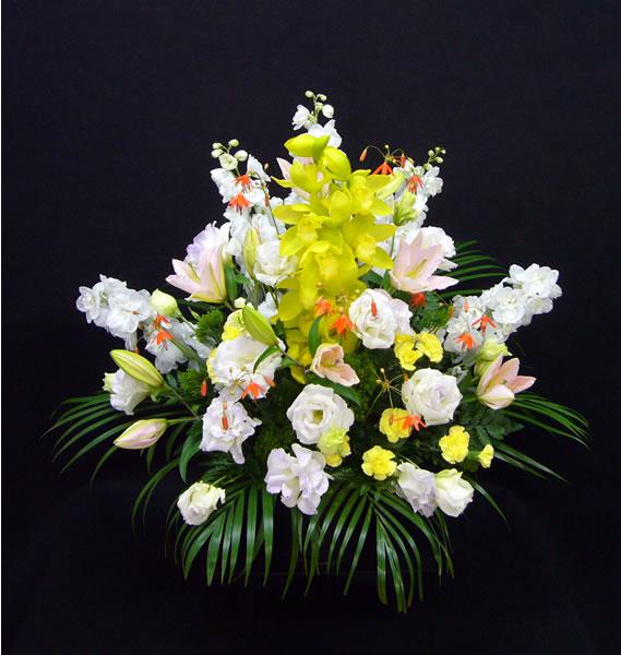 一周忌の法事用のご注文です。といっても別に色が決まっているわけではありません。今回はきれいな白のデルフィニュームが入荷していたので白を基調に作ってみました。こちらは10500円です
