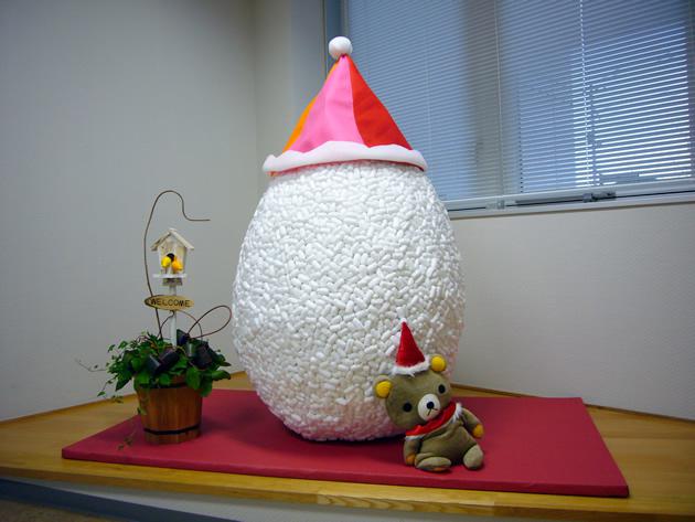 検診センターさんへディスプレークリスマス編です。巨大卵にでかでか帽子をかぶせました。高さは60センチ帽子周りは180センチあるのだー。帽子はフェルトで作りました。お手製です。リラックマにもクリスマスの衣装を着せました。壁も白いから来週ちょっとアレンジをプラスしよー。