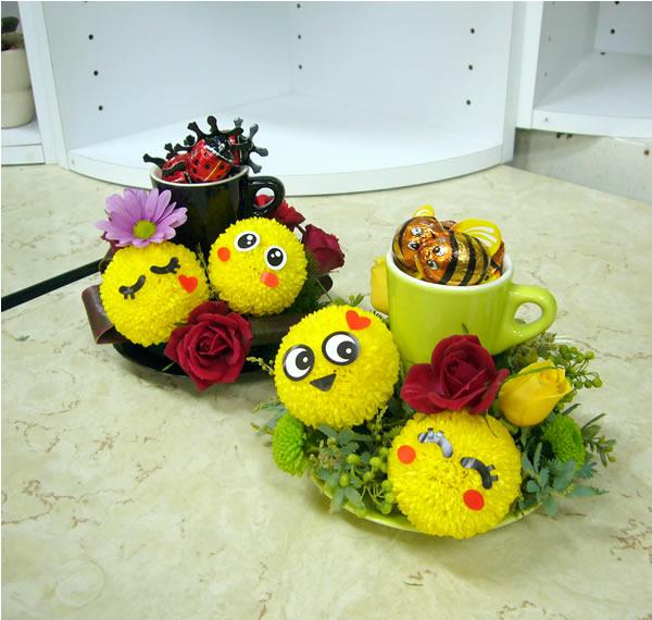 商品開発室より、出来たてのバレンタインのアレンジメントで〜す。ラブラブな二人のイメージで製作いたしました。彼氏だけでなく、お父さんに、お子さんに、だんな様にいかがですか。ちなみにチョコはおまけで〜す。お好きなチョコがあればそちらと詰め替えいたします。