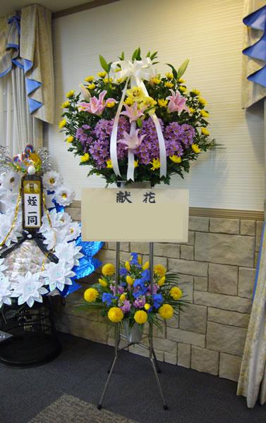 こちらは15750円です。21000円と比べて上の段も下の段も少し小さめです。最近はきれいなピンポン菊が入荷しております。今週のお悔やみのお花はピンポン菊を使用したデザインが多かったですね。