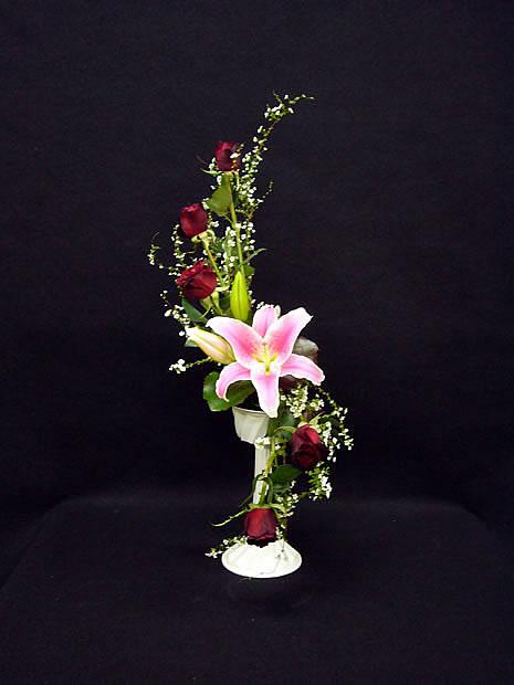 本日ではなく昨日の教室。前回の基礎を元に応用編です。真ん中にユリのようなポイントになるお花を入れて形作っていきます。あくまでもフォーカルポイントが一番前にくるように気をつけて生けましょう。それと枝先の流れが要チェック。ユキ柳は特に枝先がいろいろな方向を向いているので、枝を整理して使用します。(風情があっていいのですがね。)