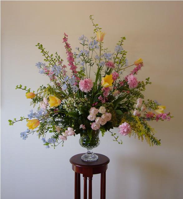 私はカメラマンとして作品を撮影したのですが・・・。やはりプロのようにはいきません。あしからず。ということでこちらはペディスタル。やわらかい色合いで生けてありますね。ガラスの器に生けてあるので透明感があって優しいアレンジです。