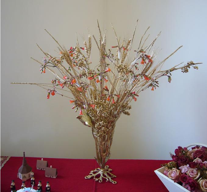 金色の柳、金色のペッパーベリー、金色の麦などでまとめたあと、