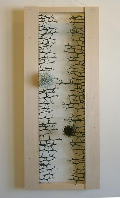 これは、カラタチのトゲをまとめたものです。白いほうは、トゲ一本一本に白ラメの刺繍糸を巻いてあります。