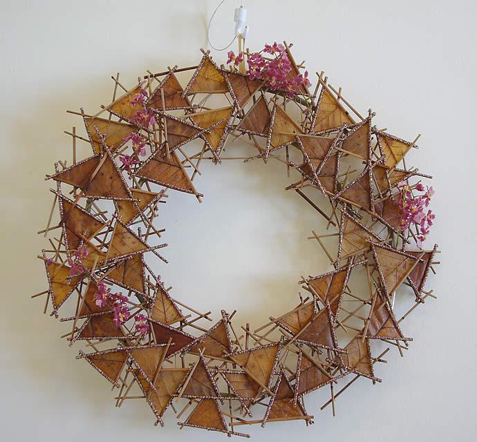 リード(葦ですね)のリースです。リードを銅のワイヤーで三角形にしたものをリースの形にまとめています。一部のリードには紫系のミックスラメの刺繍糸を巻きつけて、クヌギの葉を貼っています。