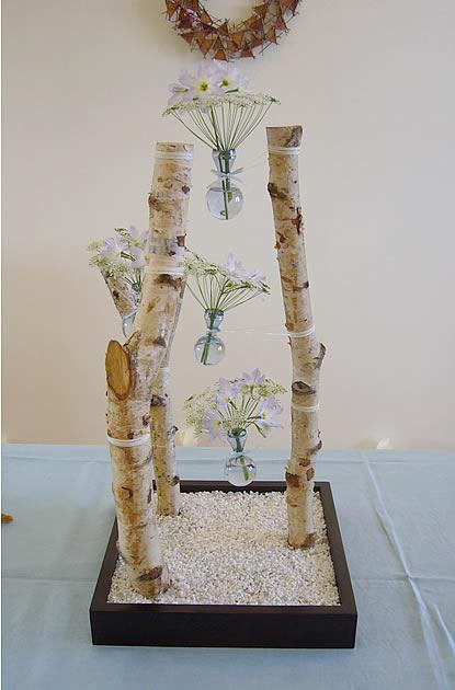 太い白樺の木の間にテグスを渡して、水色のフラスコを浮かべています。あまり見たことのないフラスコだと思ったら、お友達からのロンドン土産だそうです!