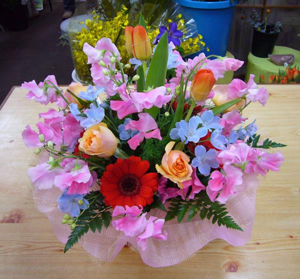 こちらは送別会用5250円です。チューリップもスイートピーも今の季節ならではですね。春はお花の種類もたくさんあるし色も豊富だしつくづく作っていて楽しいです。華やかにとのご注文でしたので色とりどりのお花を使ったら、虹のようにカラフルなアレンジになりました。