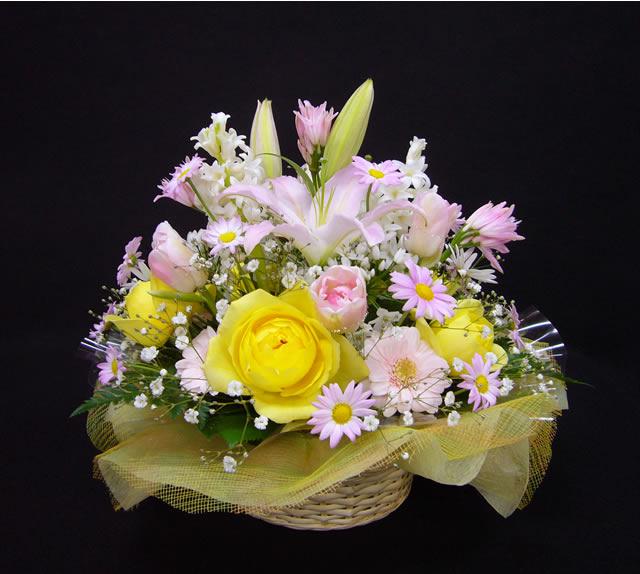 こちらのお花はご栄転のお祝いのお花です。この時期、送別会のお花のご注文が多いですね。小さいお子様がいらっしゃるということで優しい色合いのお花を使いました。ヒヤシンスが入っているのでとっても香りのよいアレンジメントです。