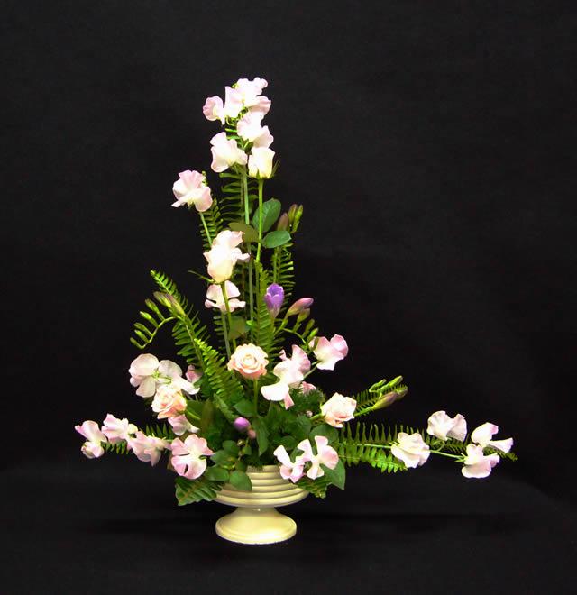 スイートピーの入荷も終わりです。暖かくなると急に日持ちが悪くなってきます。ということで今回のLシェイプの基礎科ではスイートピーを使用いたしました。フリージアも春ならではの花材。フリージアはお花の向きに注意しましょう。
