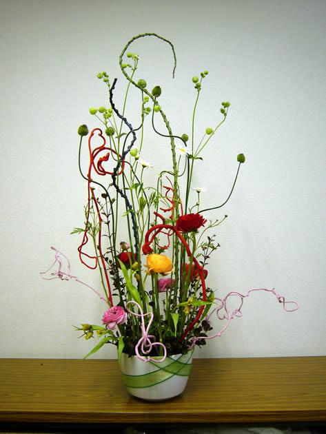 私が持っていった花材は、お手本とはちょっと違う雰囲気でしたが・・・。