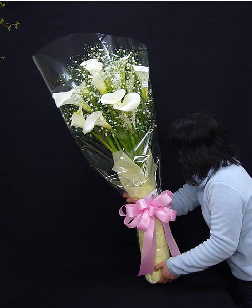 カラーの好きな方へおくるお祝いの花のご注文をいただきました。花瓶に飾ったら見事でしょうね。こんな花束をいただいたら友達を家に呼んでお茶でもしたくなりますね。