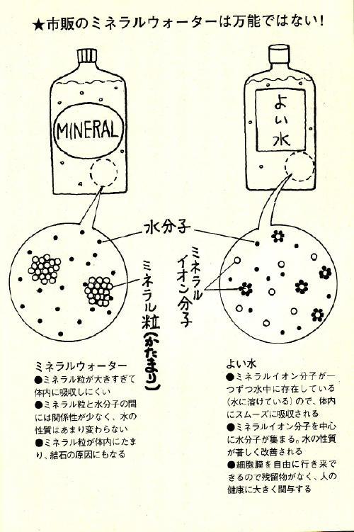 本当によい水とは、ミネラルがバランスよく溶け込んでいる(イオン化単分子として存在する)水です。よい水であればおいしく飲め、体内へミネラル吸収率も非常に高く、その吸収の過程で有害な物質も発生しないので、体をよい状態へと導いていきます。