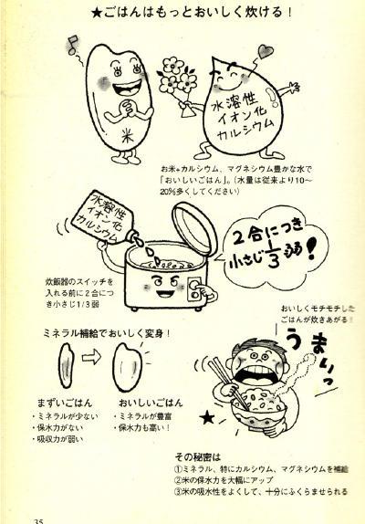 昔、ごはんがおいしいといわれていたころ、どの家庭でも「三種の神器」、ミネラル豊富な井戸水や湧き水、薪、カマドでごはんを炊いていました。現在、そのいずれも失われた遺産といえるものです。しかし、カマドと薪に関しては家電の進化によってより美味しい炊き上がりを期待できるようになりました。絶望的なのは水です。炊飯のたびにミネラルウオーターを惜しげもなく使うことは、一般家庭にとっては非現実的な提案でしょう。ところが、水溶性イオン化カルシウムを米2合あたり小さじ1/3