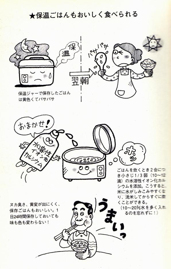 それではどうしたら保温ジャーで美味しくごはんを保存できるでしょう。あのいやな黄ばみやヌカ臭いニオイ、パサパサ、ボソボソを少なくする方法の1つとして水溶性イオン化カルシウムをお奨めします!