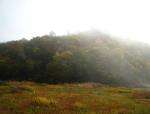 靄が立ちました、今は川の方から流れて来ます。こんな風景を見ていると上杉謙信と武田信玄の川中島の戦いを連想して見ました。おそらく靄の深さはこんなものではないはハズです。