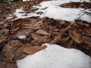 もう、雪の下の落葉には茶の色しか残っていません。このまま落葉は雪の下で来年の肥料になるんですね。