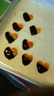 伊予柑ピールは薄いので、ハート形に切って、カカオ71%のビタースィートでコーティングしてみました!