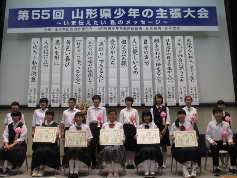 第55回目となる「山形県少年の主張大会」を平成28年9月25日(日)に山形市のビッグウィングで開催しました。県内4ブロック大会から選出された15名の中学生が参加し、学校生活、家族、友人との関わりなどにおけるテーマについて、課題の気づきや改善への取組みを熱く訴えました。「『伝える』ことで、つながる心」と題して発表した南陽市立沖郷中学校3年 青野 瑞希さんが最優秀に選ばれました。