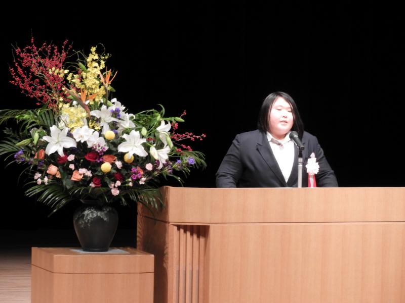 はじめに、第57回山形県少年の主張大会で最優秀賞を受賞した天童市立第三中学校3年岩淵礼姫さんが「人生を駆け抜ける」と題して主張発表しました。中学に入学後受けたいじめの経験から学んだこと、それを通して成長できたことを社会に生きているすべての人に伝えたいと発表しました。