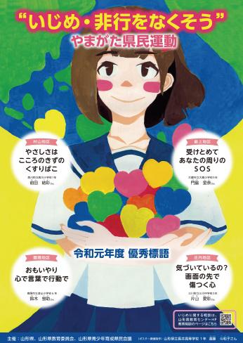 このポスターには、県内小中学校、特別支援学校の児童生徒から応募があった「いじめ防止標語」から選ばれた優秀作品4点、また、いじめ相談の問い合わせ先QRコードを掲載してます。