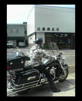 ジムのお向かい、近藤仏具店さん(お盆のご用命はこちらへどうぞ!)をバックに愛車ハーレーと2ショット。