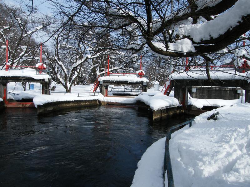 山形県長井市野川土地改良区が管理する分水工です。向かって左側が西根、致芳方面に流れる1号幹線水路、 中央が野川本流に戻される水路、 左が平野、中央地区、飯豊方面に流れる2号幹線水路です。この水が長井市、飯豊町の耕地3000haの耕地と生活用排水に利用される。http://www.inakajin.or.jp/nnnews/nn11-12-2.html