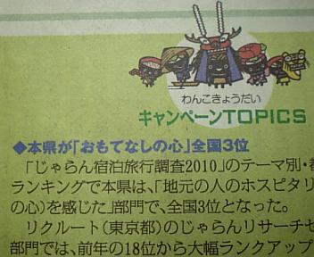 「じゃらん宿泊旅行調査2010」のテーマ別・都道府県別魅力度ランキングで本県は、「地元の人のホスピタリティ(おもてなしの心)を感じた」部門で、全国3位となった。