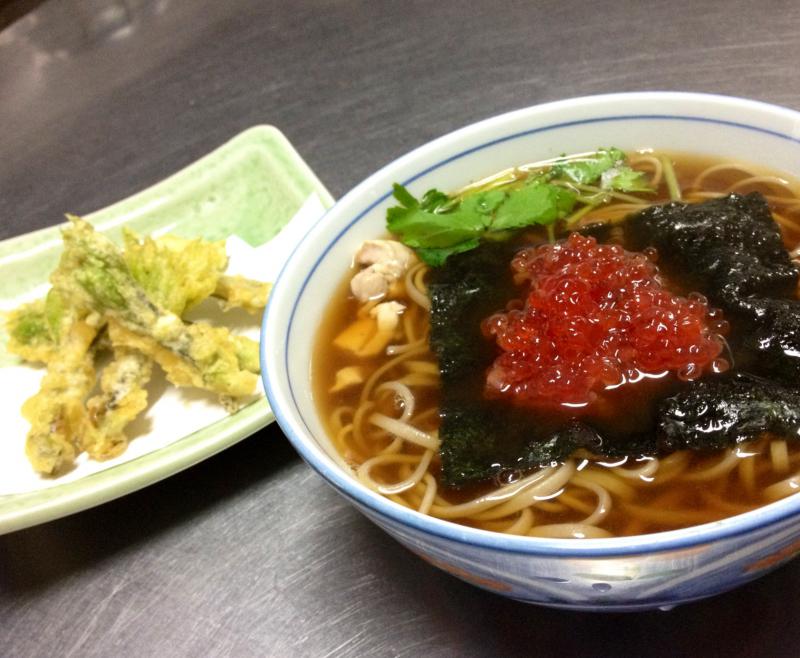 今日の昼ご飯は、大好きな「すじこそば」と、「コシアブラの天ぷら」です♪