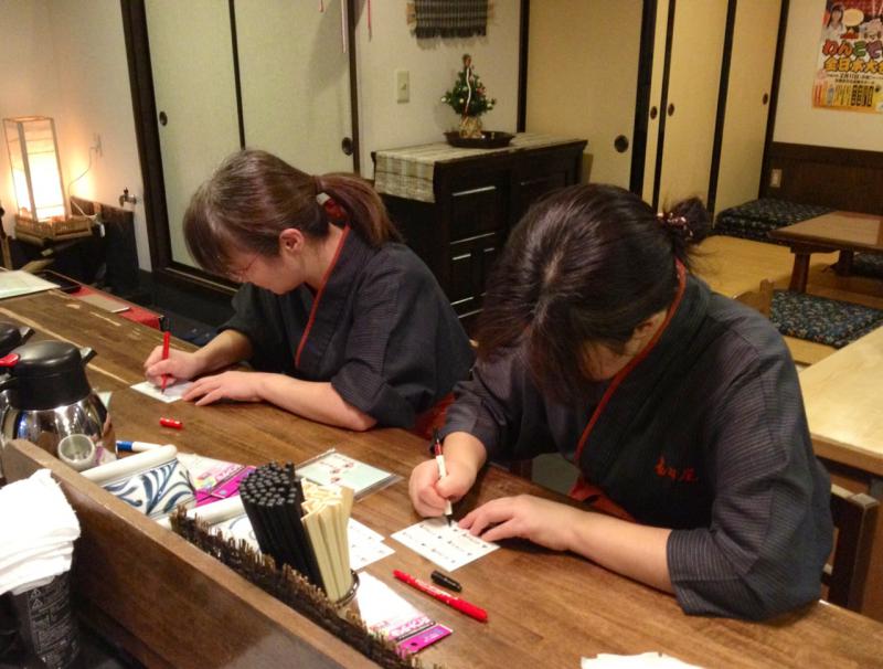 年越し蕎麦用のそばつゆのボトルに貼り付けるラベル書きに勤しむ「かじやの筆耕美人姉妹」(*^_^*)