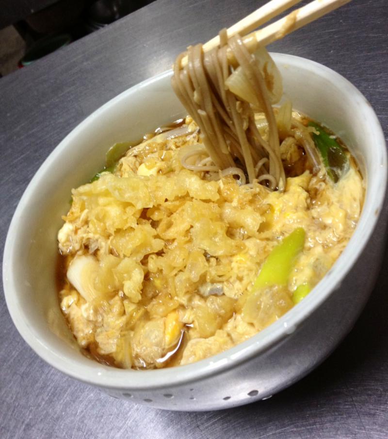今日の昼ご飯は、わんこそばで余ったそばで「たぬきとじそば」にしました♪