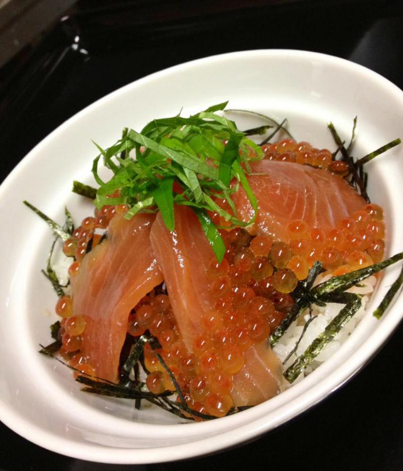 今日の昼ご飯はこの季節限定、シャケといくらの紅葉漬けを、熱々ご飯に乗っけた「紅葉丼」です♪