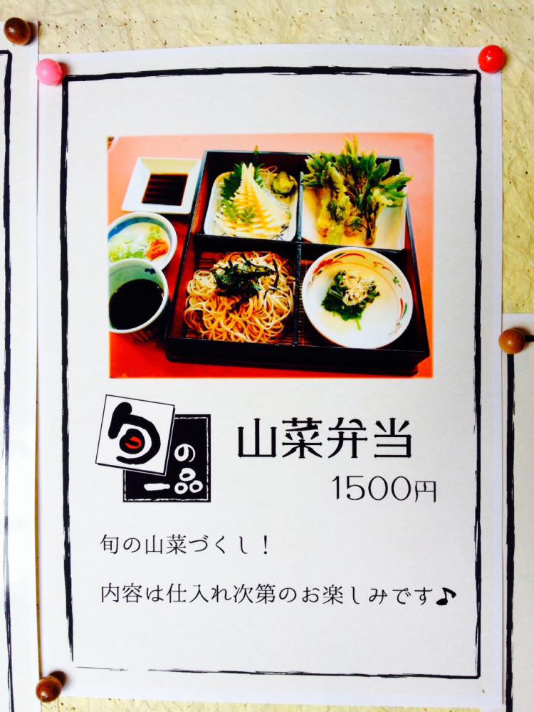 竹の子の刺身や山菜の天ぷら、山菜のお浸しや炒め物などに、冷たいおそばの入った「山菜弁当」がオススメです(≧∇≦)