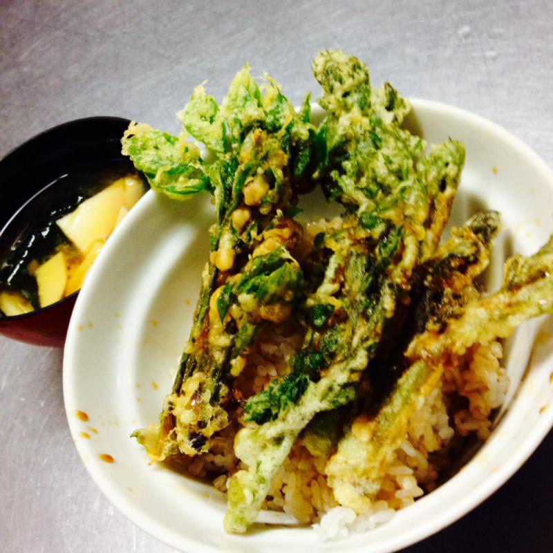 今日の昼ご飯は「タラの芽とコシアブラの天丼、竹の子の味噌汁付き」です♪旬の山菜尽くしで最高です(≧∇≦)