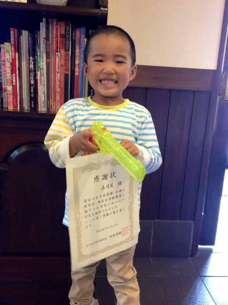 禁煙の飲食店として美味しい空気をお客様に提供したということで、感謝状をいただきました(o^^o)