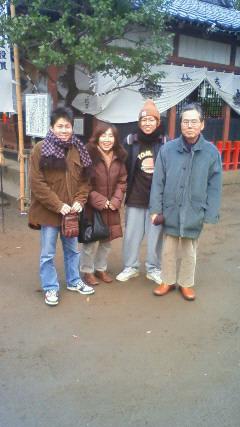 今日、近くの一之宮神社へ行きました。そこで、どこかで見かけた小柄な四人家族に会いました。50代後半の親父を除きあとの3人は至って健康・陽気な隼人(の末裔)といった雰囲気の家族です。この家族は南北日本の地域住民に向けて、金融不況に負けず元気を出せ!とエールをおくっています。その写真を送ります。