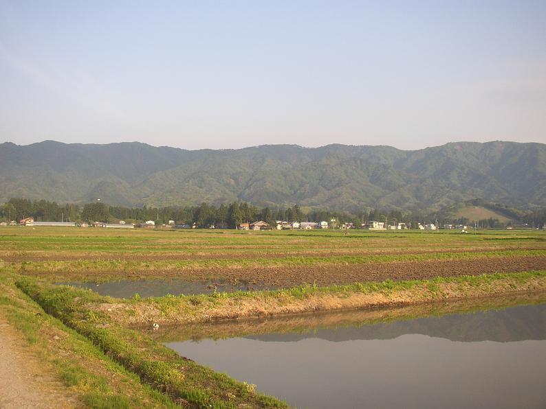 <写真は田植え前の田んぼと我が集落、そして朝日連峰です。ダブルクリックでアップにしてご覧ください。>
