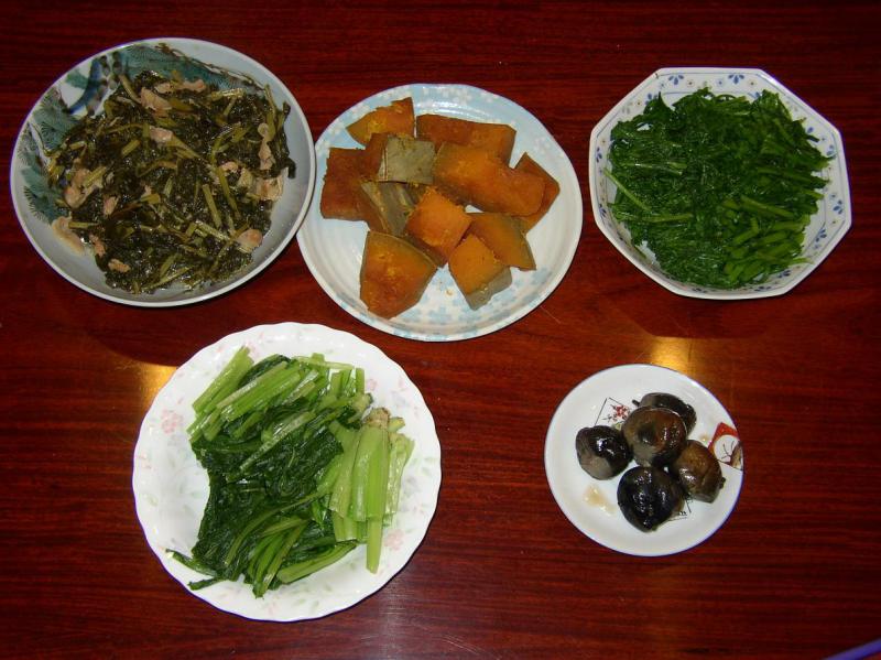 我が家の家族は野菜が好きだ。80代後半になる両親、われわれ夫婦、それに一緒に農業している20代の息子も食事のたびに山盛りの野菜料理をせっせと口に運ぶ。今朝の食卓も野菜づくしだ。大きな器にだいこん葉やかぼちゃの煮物、春菊とくきたちのおひたしなどの野菜料理が盛られ、テーブルいっぱいに並ぶ(写真)。いつか、東京から来た友人が「毎日この量をスーパーから買い込んだとしたらすぐに家経費が底をついてしまうな。」と笑っていた。