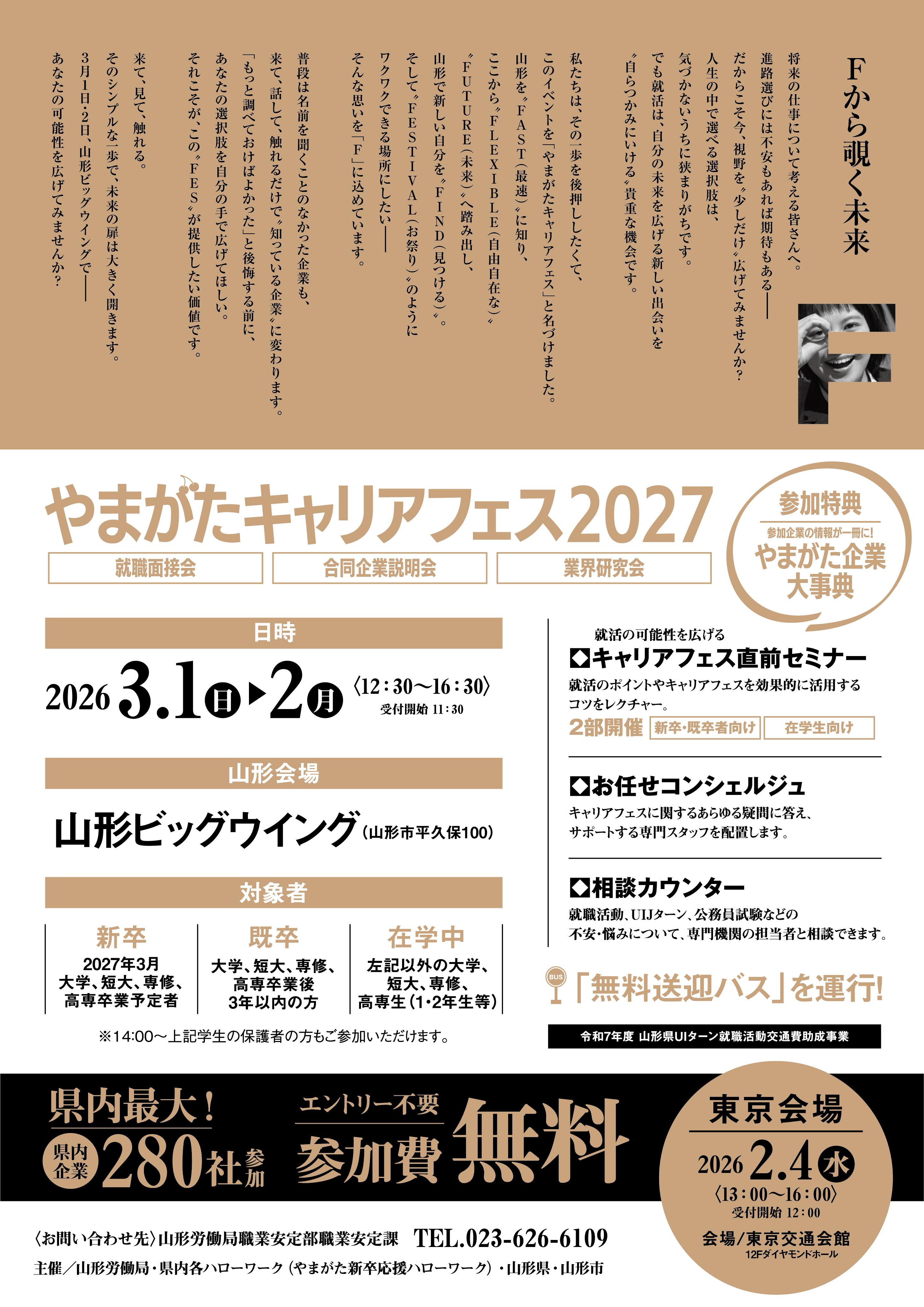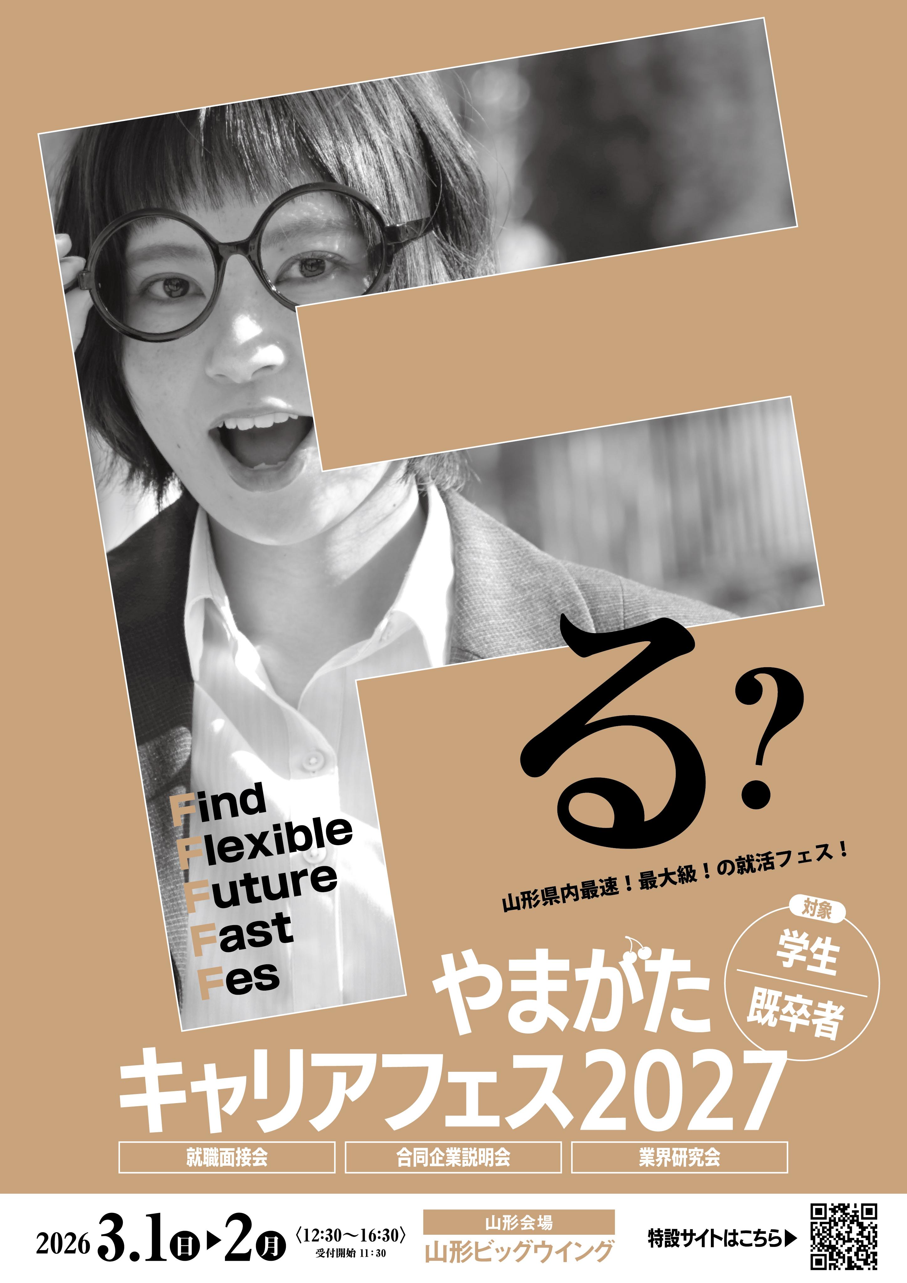 3月1日(日)に山形ビッグウイングで開催される、「やまがた合同企業説明会2027」に当社でも最上1ブースで参加します。是非、御家族・御友人・お知り合いにご紹介していただき、ご参加のほどよろしくお願いいたします。きっと、いい出会い・いい会社が見つかりますよ。最上1ブース柿﨑工務所でお待ちしております。